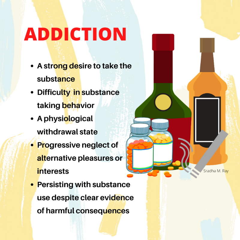 Addiction is a chronic dysfunction of the brain which is due to the faulty habit formation based on the reward, motivation and memory. Addiction can be caused due to dependence on a particular substance that the body craves for or even behavior which can be as healthy as exercising. Addiction causes a compulsive or obsessive pursuit of the desired reward and doesn’t process the consequences of that in the short or long time. Some people experiencing addiction will be unable to stay away from the substance or the behavior and display a lack of self-control; along with having an increased desire for the substance or behavior and ignoring the negative consequences which can be biological, social and psychological in these cases. Addiction of substance include substances like Alcohol, Nicotine/Tobacco, Opioids, Cannabis/Marijuana, Prescription pills, Sleeping pills/Sedative hypnotics, Stimulants like caffeine, Cocaine, Hallucinogens like Psilocybin mushrooms (Magic mushrooms), Volatile solvents like paint thinners and any psychoactive substances which have the capability to change/alter the neurochemical processes of the brain along with causing faulty reward pathways. Behavioral addictions are explained in the section of Adult Psychiatric disorders.