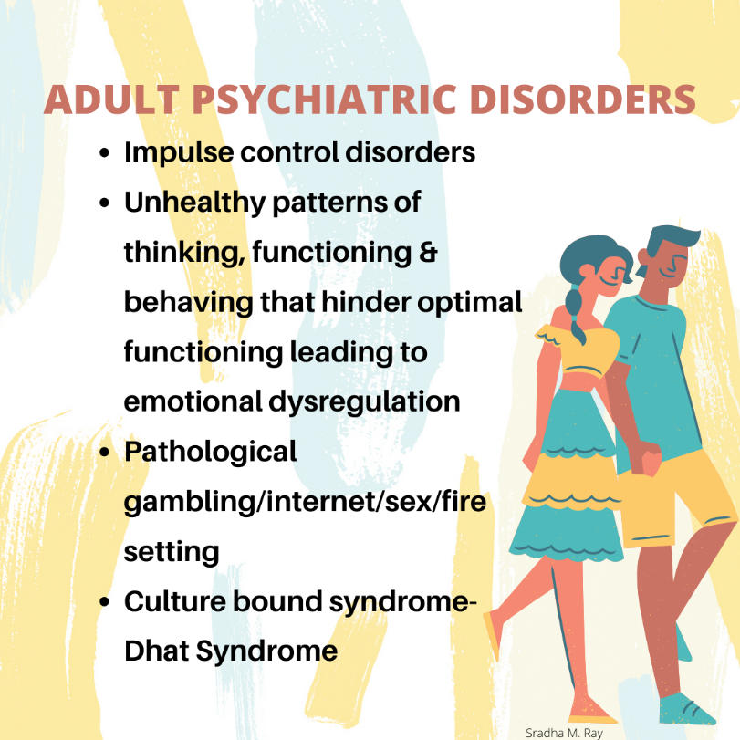 Adults from the age group of 16 onwards due to multiple factors like biological, psychological or social can develop various mental health conditions which require medical attention. These illnesses can be Panic disorder, Generalized Anxiety Disorder, Post-traumatic Disorder, Social Anxiety Disorder, Obsessive Compulsive Disorder, Adjustment or Stress related disorder, Substance or Behavioral Addiction as well as Culture-bound syndromes like Dhat. Adults may face difficulty in mood regulation, distress due to thoughts and even psychosomatic symptoms like headache, nausea, backache, and so on. Anxiety and Depression are the most common disorders that can affect due to work-life stress, family conflicts, relationship issues and even sexual disorders. Adults can also face serious mental health issues due to deficit in the coping skills. Treatment of adult disorders are generally done holistically by medications along with psychotherapy or counselling for thought substitution or thought replacement.