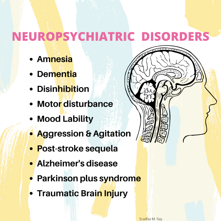 Neuropsychiatric disorder is a blanket medical term that encompasses a broad range of medical conditions that involve both neurology and psychiatry. Common neuropsychiatric disorders include seizures, attention deficit disorders, cognitive deficit disorder, cerebral palsies, uncontrolled anger, migraine headaches, Dementia is the loss of cognitive functioning—thinking, remembering, and reasoning—and behavioral abilities to such an extent that it interferes with a person’s daily life and activities. These functions include memory, language skills, visual perception, problem solving, self-management, and the ability to focus and pay attention. Some people with dementia cannot control their emotions, and their personalities may change. Neuropsychiatric disorders can occur in children too due to traumatic brain injury, infections, medicine side effects, ADHD, genetic predispositions or environmental factors resulting in problems with focus and learning, also emotional dysregulation and irritability which requires pharmacotherapy and rehabilitation therapy for support and functioning.