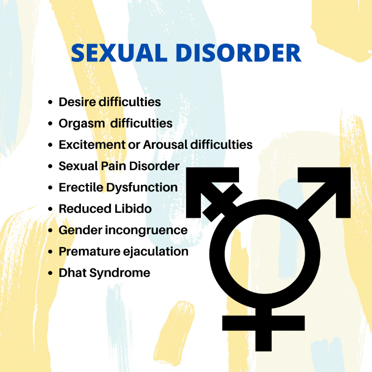Sexual dysfunctions can be classified into 4 categories: Desire disorder which is a lack of sexual desire or interest in sex, Arousal disorder which is the inability of becoming physically aroused or excited during sexual activity, Orgasm disorders i.e., delay or absence of orgasm or climax and finally the Pain disorder which indicates that there is pain during intercourse. Sexual dysfunctions can occur at any age, however most commonly after 40 years of age because its often related to a decline in health associated with aging. In men it can present in the inability to achieve or maintain erection (hard penis) which is known as erectile dysfunction, there can also be absence or delayed ejaculation despite of there being enough stimulation known as retarded ejaculation and even sometimes the inability to control the timing of ejaculation. In women specifically there can the inabilities of achieving an orgasm, inadequate vaginal lubrication before and during the intercourse along with inability to relax the vaginal muscles enough to allow intercourse. Causes of sexual dysfunction can be many started from biological like diabetes, heart disease, neurological disorders, hormonal imbalances and also psychological like work-related stress and anxiety, concern related to sexual performance and marital or relationship issues/conflicts, even sexual dysfunctions are commonly seen along with depression, body image issues and presence of past sexual trauma.