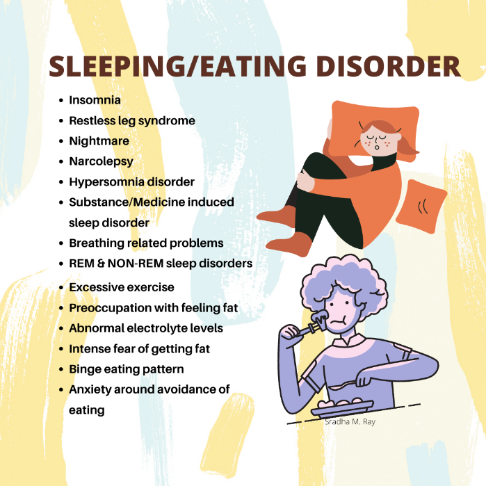Sleeping disorders can present with symptoms or forms like insomnia, snoring, obstructive sleep apnea, sleep hyperventilation, restless legs syndrome, narcolepsy, bruxism, sleep talking/walking, nightmares & night terrors and rapid eye moment behavior disorders. The common causes of sleep disorder may stem from concerns about work, school, health, family leading to anxiety in many cases, even stressful events or trauma such as death or illness of a loved one, divorce or loss of job. Eating disorders on the other hand are characterized by abnormal or disturbed eating habits and these are quite common. The most common eating disorders are serious conditions that can negatively impact your health and emotional wellbeing and includes disorders like anorexia nervosa, bulimia nervosa and binge-eating disorders. There can be warning signs of eating disorders like not eating enough, being underweight, being obsessed with & terrified of gaining weight, constipation, dizziness along with sleep disturbances.